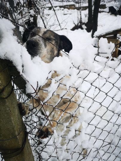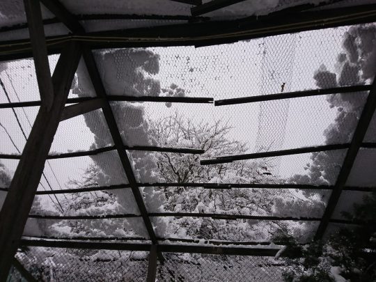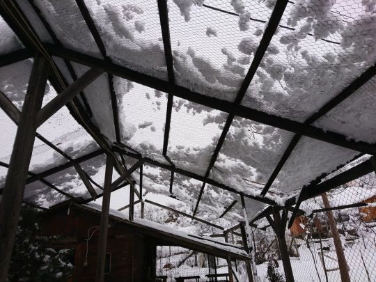 The heavy snow on top of the cat enclosure is about to come crashing down! We are trying to get it off but it is very hard and every time we try to remove it, the wooden structure keeps falling apart.